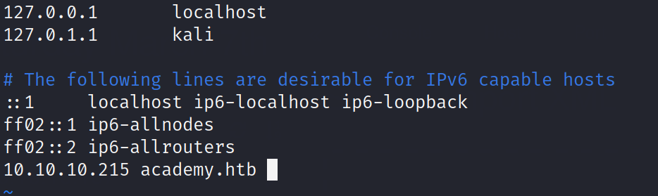 An hour, 16 minutes and 34 seconds to complete. I told you AutoRecon takes longer. One of the first things we notice is that there is a webserver running. Apache httpd 2.4.41 (Ubuntu). However, Navigating to it brings up a search instead of the webserver's page. Add '10.10.10.215 academy.htb' to your /etc/hosts file. Now we can navigate to academy.htb and get a login page.
