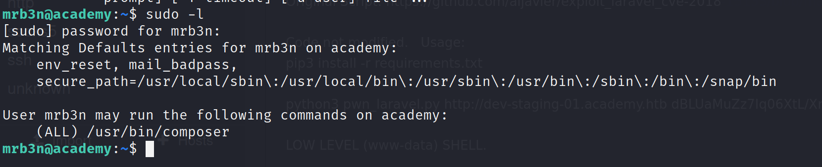 Time to create/utilize a "save point". We can SSH to the box with those credentials. So, if anything funky was to happen, we've got an easy way in without having to start from scratch. So, what can mrb3n do. sudo -l shows the account can run sudo on composer! Composer is one of the GTFObins!!