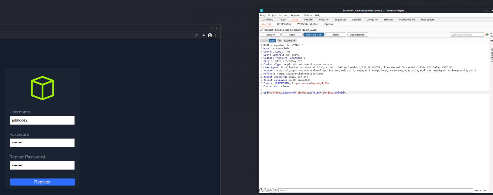 Ah HA! We found an admin.php page. We can't log into it with johndoe. Let's create another user, johndoe2, but this time capture the request and change that roleid to 1 and see what happens.