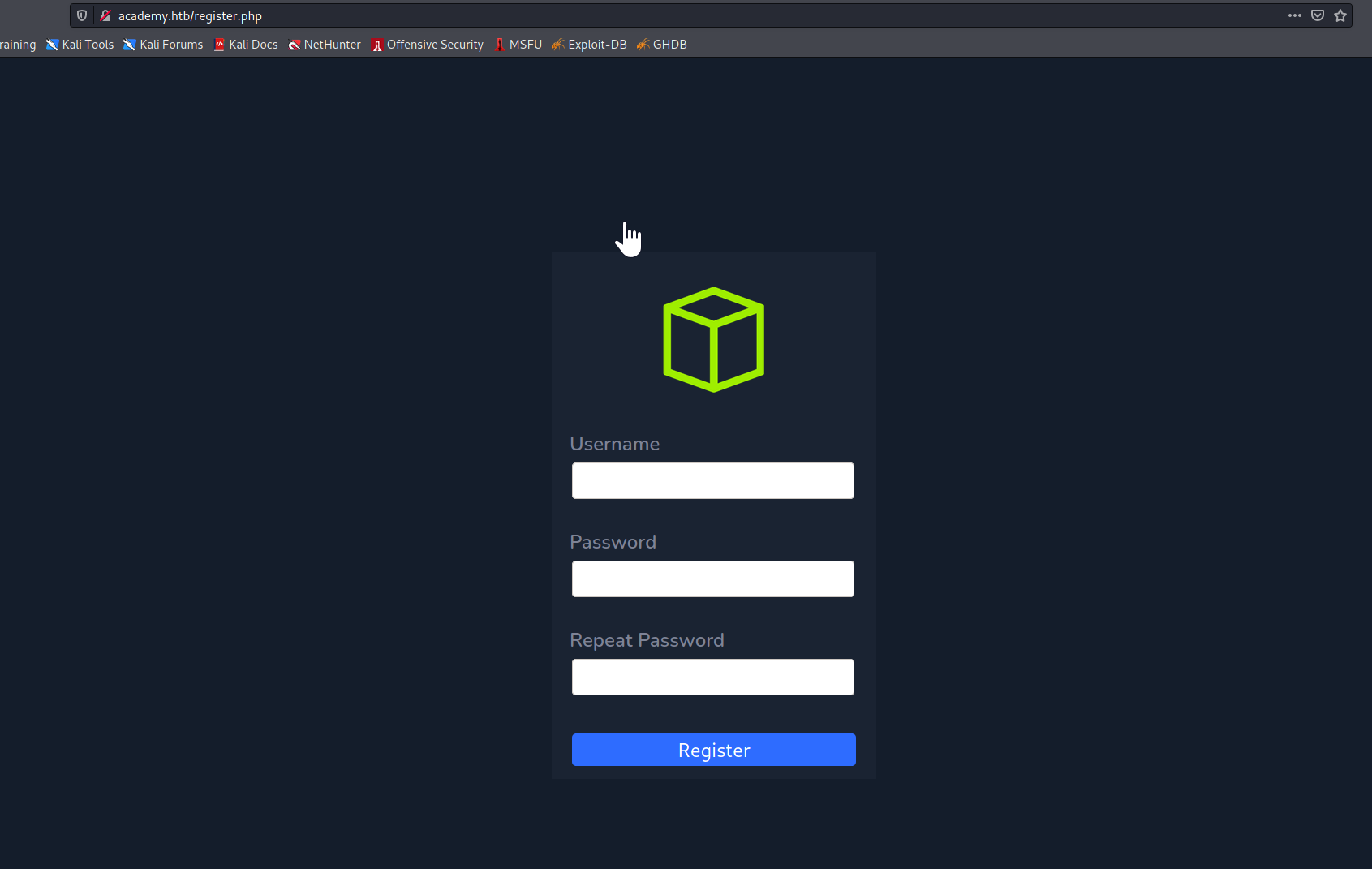 After we create the user, it takes us to the Login page. We can use the new credentials to login and we see some Modules for the HackTheBox Academy (Nice Touch. It's usually the whole Lorem Ipsum thing). One thing the capture on creation shows us is an "&roleid=0". That variable might be useful later. For now, let's run Gobuster on it and see what else is there for us to find. We can do that with "gobuster dir -u http://academy.htb -w /usr/share/dirb/wordlists/common.txt"