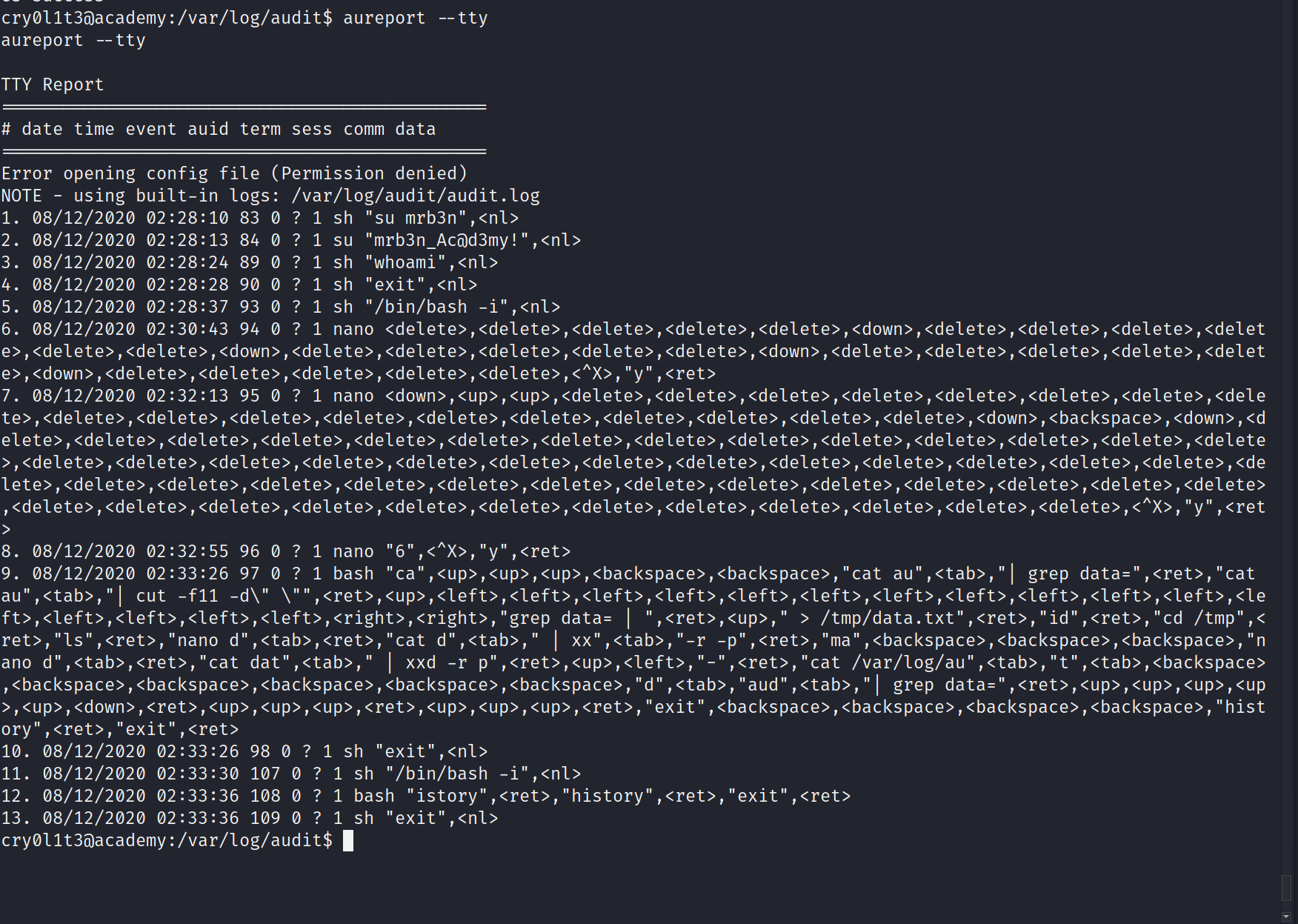Another bit of interesting. Audit Logging is enabled. Let's check the main Audit log, using aureport, and see if there are any other nuggets of info we can use.