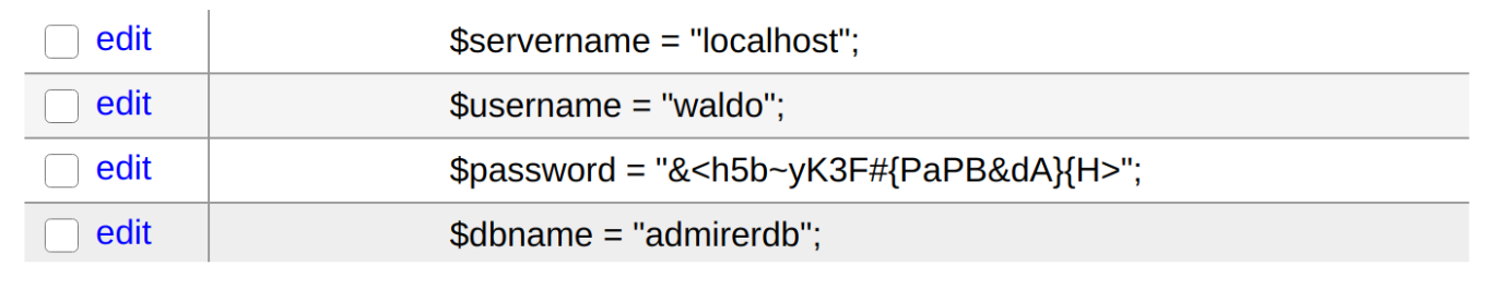 Adminer is a MySQL management tool and we know there's a MySQL instance running on 3306. Trying to log in with either of the two waldo credentials we've already found, fails miserably. A little bit of research later and I find this https://infosecwriteups.com/adminer-script-results-to-pwning-server-private-bug-bounty-program-fe6d8a43fe6f. It looks like we're doig this the long way.