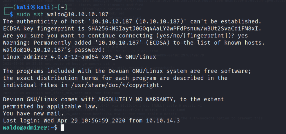 Next, we make sure that traffic is allowed between Admirer and our Attacking machine and that the connection is bound to our tun0 adapter. We do that with: