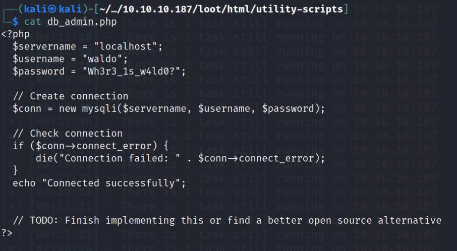 The credentials belong to "waldo". Also, if we look at admin_tasks, we see a PCI-DSS violation of a webserver revealing internal directory structure or a possible vulnerability built into the admin_tasks.php page where it calls /opt/scripts/admin_tasks.sh.
