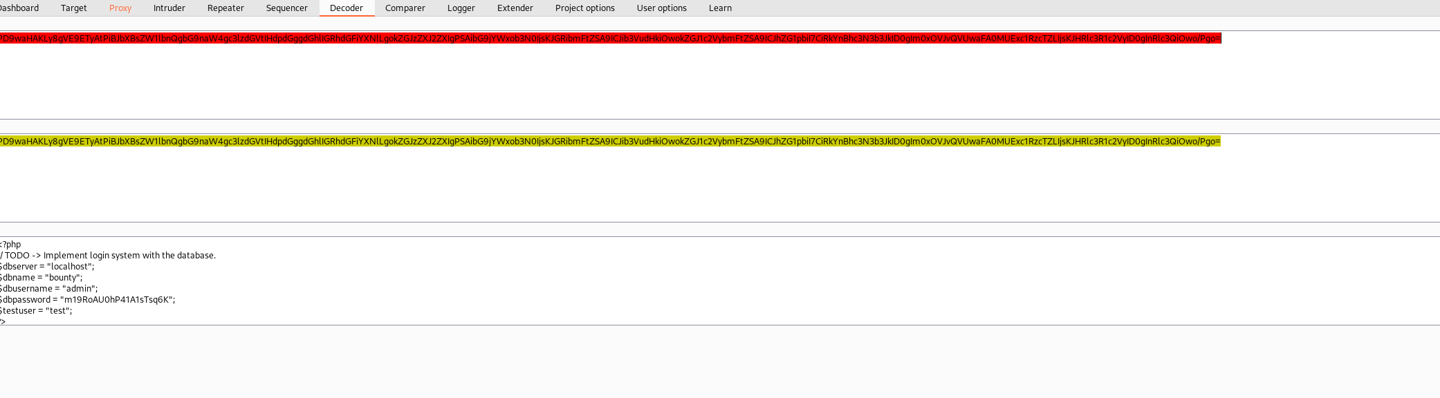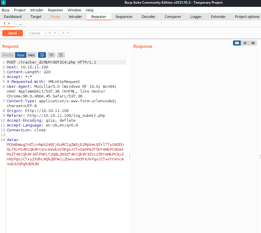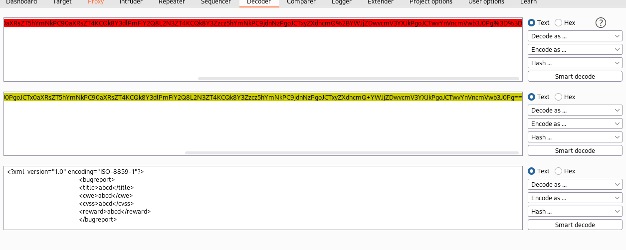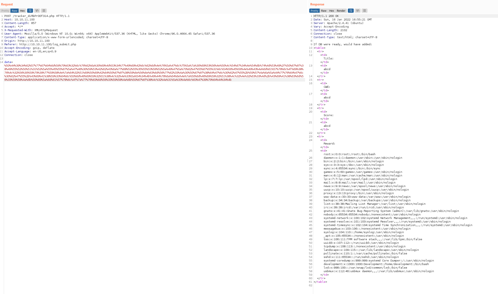 Now we take that string, place it in Decoder, encode it as URL and place that into the originally capture POST to tracker inside Repeater. With that, our XXE is validated and we've gotten the users that can SSH to the Victim.