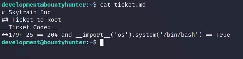 From the script, we can see that the ticket must have a .md extension, must start with Skytrain, and must include Ticket to 'something'. Let's see if we can craft one using system to call /bin/bash. I'm going to use:
