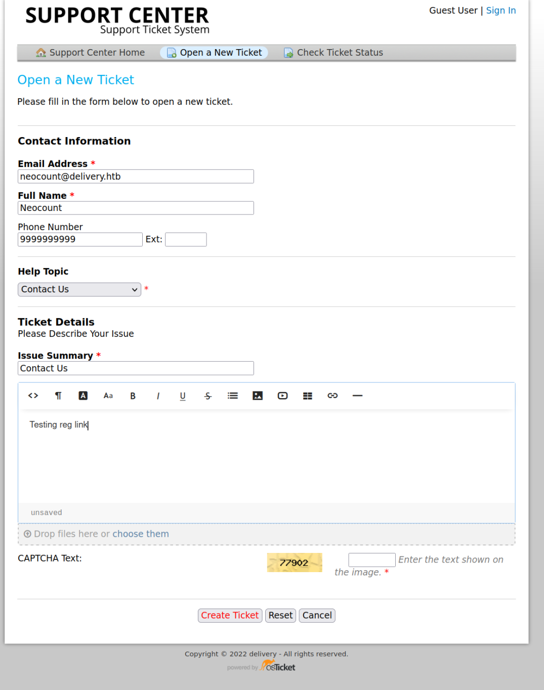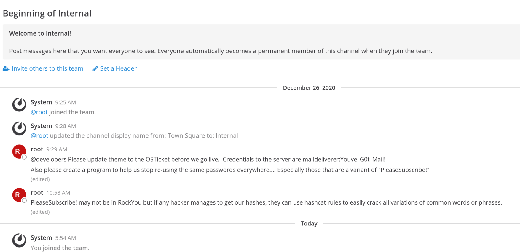 but it really only works if we have an @delivery.htb email address. Let's try opening a ticket and see what happens. Entering dummy information and submitting the ticket, presents us with a success page and (surprise) a delivery.htb email address! Now let's check the ticket status on one tab, and register on the MatterMost page at the 8065 port and see if the registration confirmation comes to us. Once we click on that registration link and sign in, we can join the internal team and see the Internal chat channel with the following goodies!