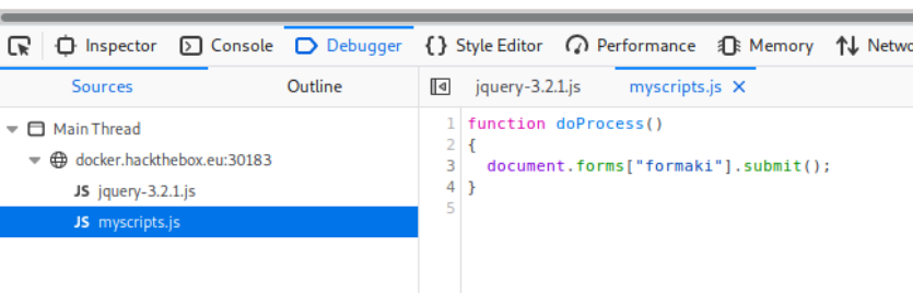When we navigate to the instance of the challenge, we are greeted with a simple login screen for Hades Distribution Company (now I know where HDC came from). Like the Cartographer challenge, the first thing I try is a SQL injection. No dice on that approach. So, I kick off Dirbuster and then take a look at the source code of the page while that runs. First thing that jumps out at me is the myscripts.js file with a doProcess() function. So, let me take a look at jquery and see if the doProcess function sends something there.