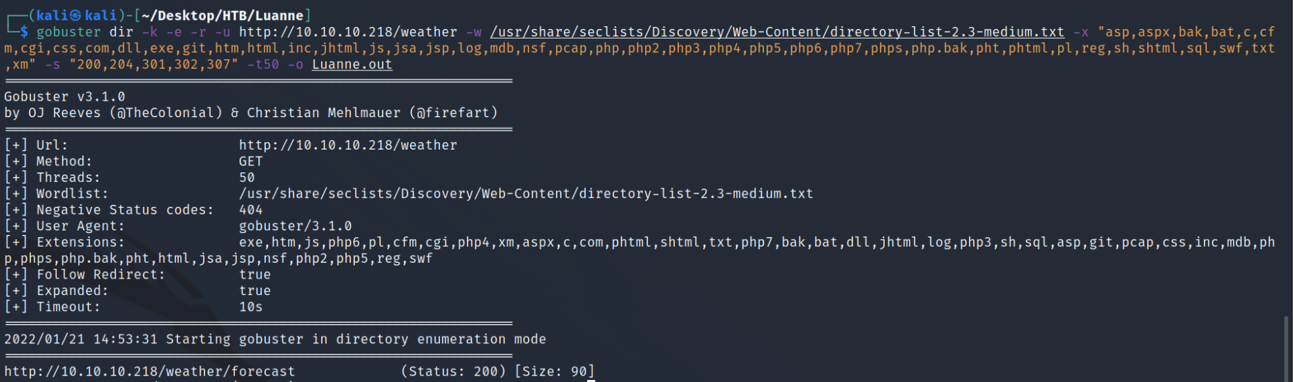 gobuster dir -k -e -r -u http://10.10.10.218/eather -w /usr/share/seclists/Discovery/Web-Content/directory-list-2.3-medium.txt -x "asp,aspx,bak,bat,c,cfm,cgi,css,com,dll,exe,git,htm,html,inc,jhtml,js,jsa,jsp,log,mdb,nsf,pcap, php,php2,php3,php4,php5,php6,php7,phps,php.bak,pht,phtml,pl,reg,sh,shtml,sql,swf,txt,xm" -s "200,204,301,302,307"