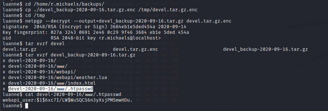 On to privesc. One of the first things we find is a backups directory and more importantly, the backups in that directory. So, no one interrupts what we're doing (or visa versa), let's copy that backup file into a different directory. /tmp will wipe everything after a few minutes, so we need to move fast. From the /home/r.michaels/backups folder, run: