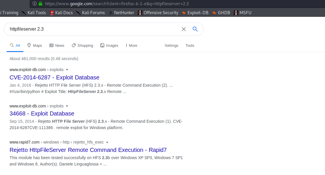 Web only, so far. While I dig into the web portal, I'm going to rescan, but with all ports. The Web Portal seems to be and HTTP File Server (HFS). There's a Metasploit module, but again, Metasploit makes us lazy. Instead, consult the great Google-Fu Master.