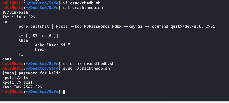 We do find a password! The password is literally "bullshit"...... No comment. So we know one of those JPGs is the keyfile, but which one? To find that out, we can use kpcli. If you don't have kpcli, you can get it with "sudo apt-get install kpcli -y and you'll be set. Again, there are 6 images. So, instead of trying each on individually, let's write a script that will do it for us.