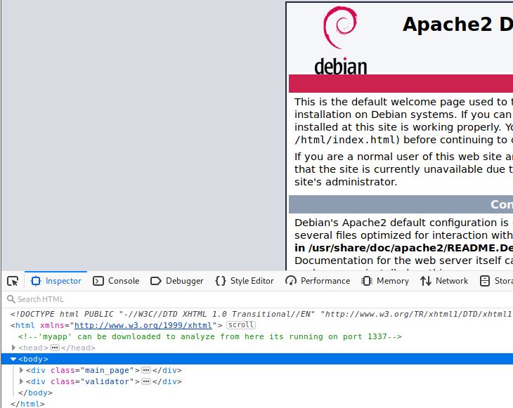 We start with SSH and Apache. There's a "waste?" port on 1337 as well. Looking at the Apache page, it looks like the default page, but check the source code on it anyway. Somebody was sneaky and points us to that 1337 page.