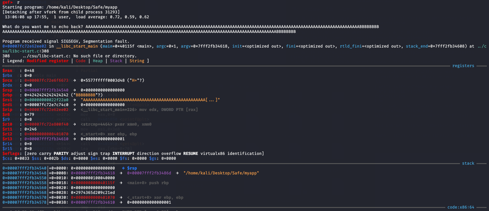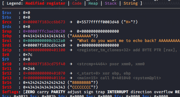 It looks like the buffer is 0x70 bytes loaded into rax and then kicked over into rdi. It looks like we can overflow it with really anything over 112 (0x70) bytes, but will it be enough. The answer to that is no. We need to kick it up to 120 bytes in order to try and control the [rip+0xe9e] above. So, we add some B's. Instant seg fault.