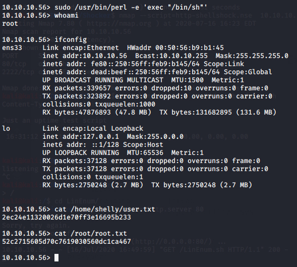 and we have a foothold as "shelly". Cute. Could be Shelly as in shell or Shelly as in Shellshock.... I like it. Move over LinEnum.sh to the /tmp folder and run it. The output is in the CTB file. The one thing that jumps out is that we can run "sudo /usr/bin/perl" without a password. So, if we run straight to /sh using: