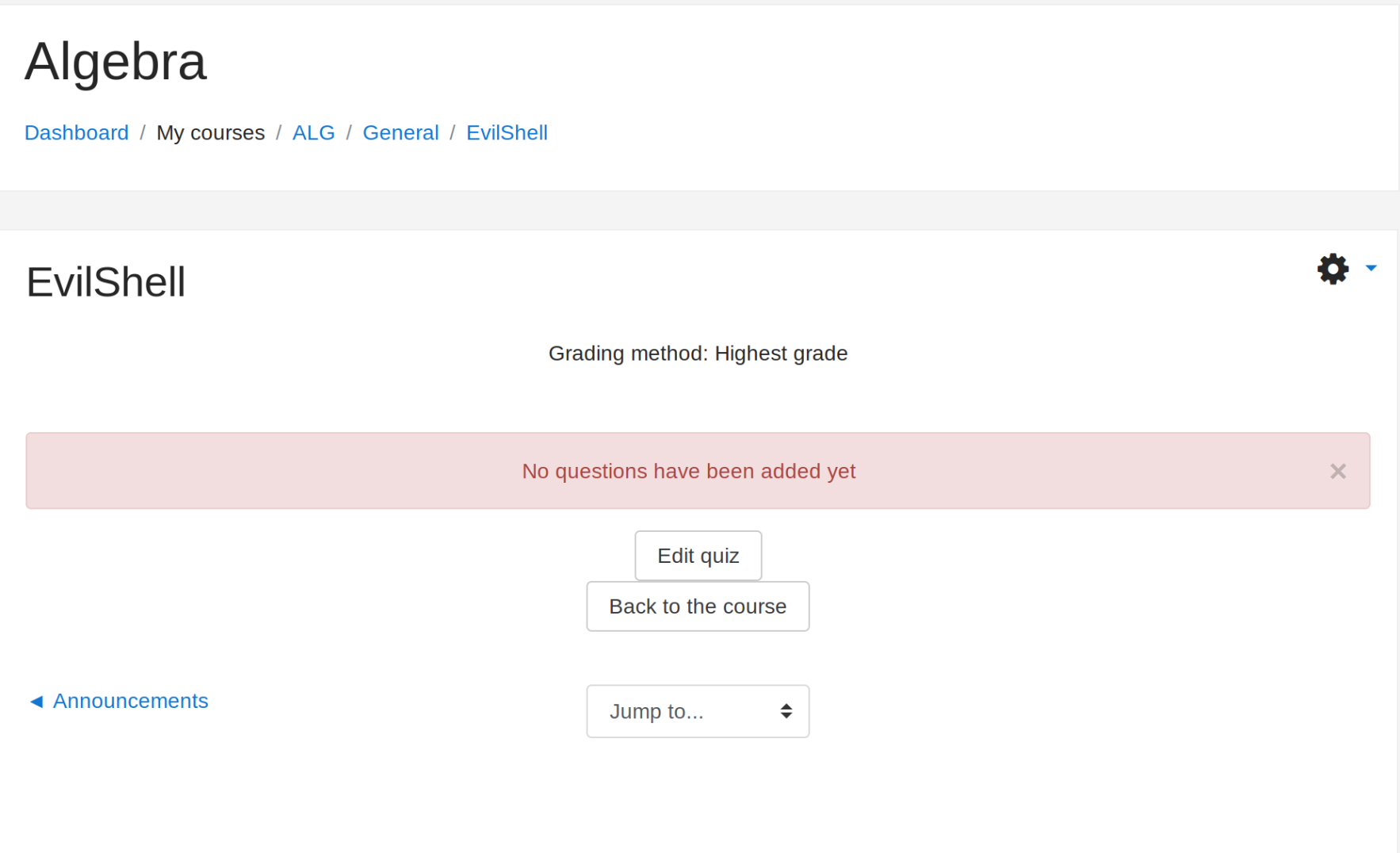 And that with we have Giovanni's creds. giovanni:Th4C00lTheacha# So let's check around Moodle for common exploits. We find a big one in https://www.exploit-db.com/exploits/46551 and it looks like it applies Moodle 3.4.1 - Remote Code Execution. They call it Evil Teacher. It allows you to create a Quiz inside of Moodle that will generate a low-level shell back to your attacking machine. For starters, go into the Algebra Course and turn editing on in the settings menu. Then you can "Add an activity or resource" and select Quiz.