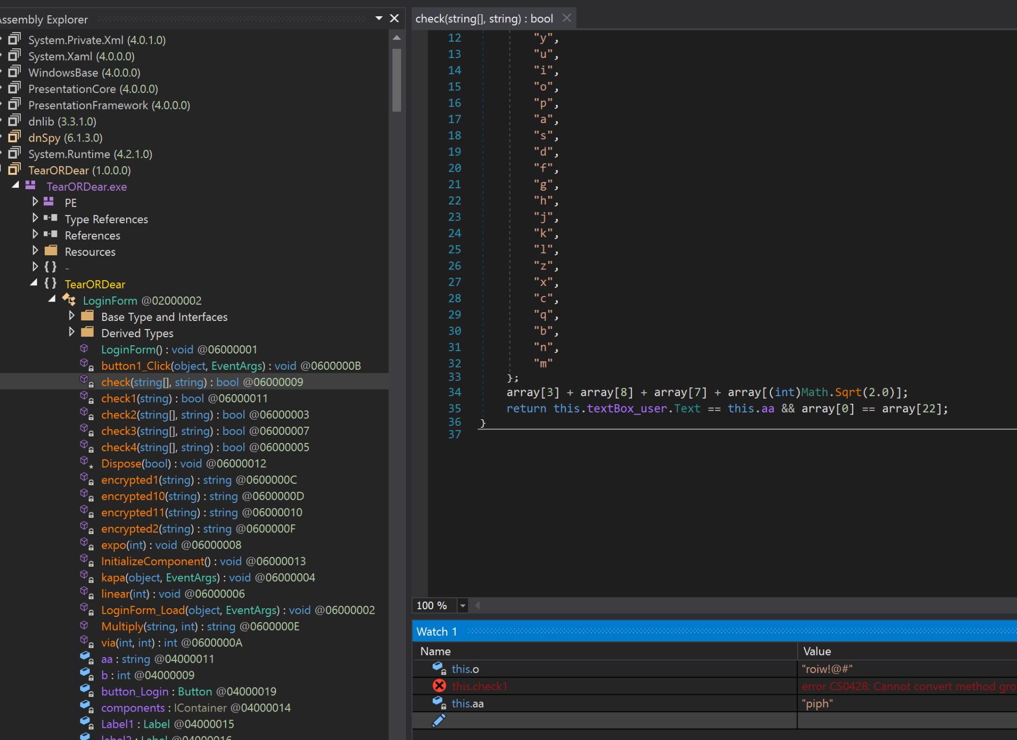 Let's set a breakpoint at that if function and check the memory. Now, some of you might have noticed that I stupidly tried to debug this in DNSpy x64 not x86. I fixed that now XD I set the breakpoint, run the program, and enter a for the userename and b for the password. Now when we add a watch to this.o and this.check1 we notice that this.check1 cannot be "watched," but that this.o's value is "roiw!@#" Why can't we watch this.check1? Because it is function logic and not really a variable. Let's follow the check1 logic path.