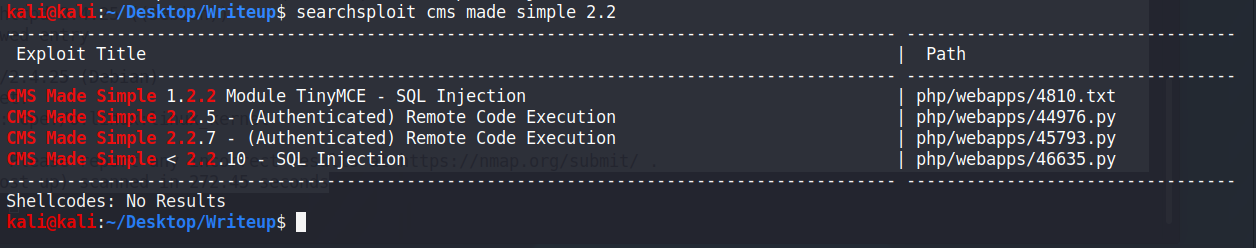We do know that there is a DoS Web App Protection script running, so brute checking directories is out, but we also know that /writeup is disallowed from the nmap script. Going into /writeup and checking the source code, we can see that it is using CMS Made Simple from around 2019 (copyright is 2004-2019). That means that it's somewhere between version 2.2.9 and 2.2.13. Running a quick CMS Made Simple 2.2 searchsploit finds a ready-made exploit for us to run some SQLi on.