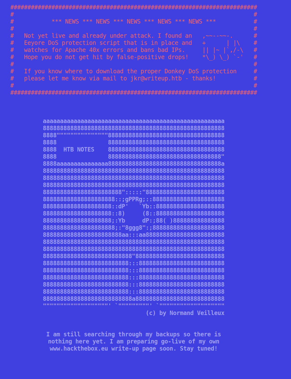 So, we are dealing with SSH, HTTP on their usual ports. Navigating to the HTTP side has a pretty dope/nostalgic/retro page on it that basically tells us that there's DoS protections in place. Like that would ever stop us, right everyone? <wink, wink, nudge, nudge> Although that does kind of kill the usual Gobuster/Dirb/Dirbuster plan.