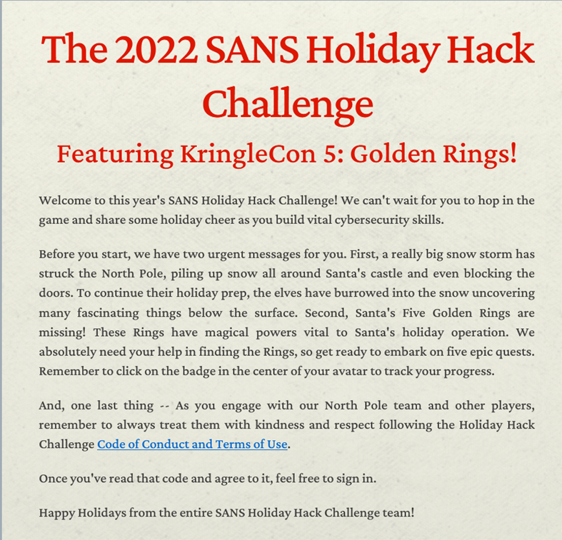 Welcome to the 2022 SANS Holiday Hack Challenge: Ed Skoudis - http://www.youtube.com/watch?v=4EStXLwBfFg