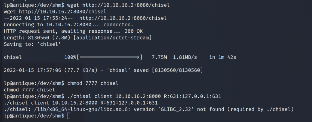 Epic fail... I am running the latest version (2021.4) of Kali and it compiled chisel using 2.32 and the printer only has 2.31. Let's try another route using the despised lazy method of Metasploit...