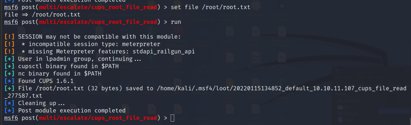 It will run through and place the flag in a loot folder. Change the FILE to /home/lp/user.txt (or just cat user.txt in your reverse shell) to get the flags.