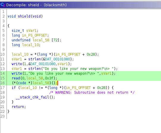 The highlighted set of code takes an input from us when it asks "Do you like your new weapon?" and executes it as code. Looking at the sword and bow functions, we see that they do not take any input from us. So, the shield function is 100% our attack point. However, we also notice another function that could bite us in the backside. That function is "sec".