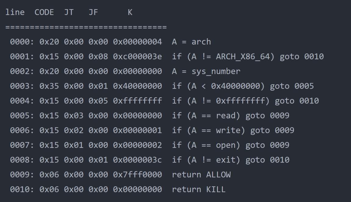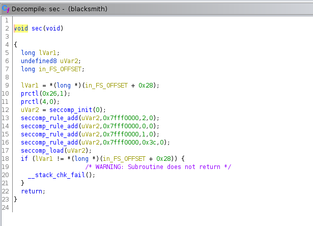 Sure enough, that's what I was afraid of. "sec" is the function to limit system calls using seccomp. If you've ever secured a Kubernetes container, you've likely used seccomp tools before, but it is primarily used to secure kernel/system calls. The man page for seccomp can be found https://man7.org/linux/man-pages/man2/seccomp.2.html and there is a Seccomp-Toolkit found https://github.com/david942j/seccomp-tools. We can use these tools to determine what rules are in place and what calls we can actually make. IMHO, this ups the difficulty, but that's not for me to decide. Using seccomp-tools, we can see that if the sys_number is read, write, open, or exit and the architecture is x64, then seccomp will ALLOW it.