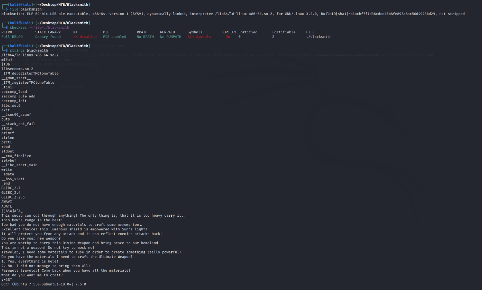 We are dealing with a 64-bit ELF Linux Binary Executable. In the "strings" output, we see several things that one might see in a Blacksmith of an RPG-style game. Let's delve deeper into the checksec command. As we can see: