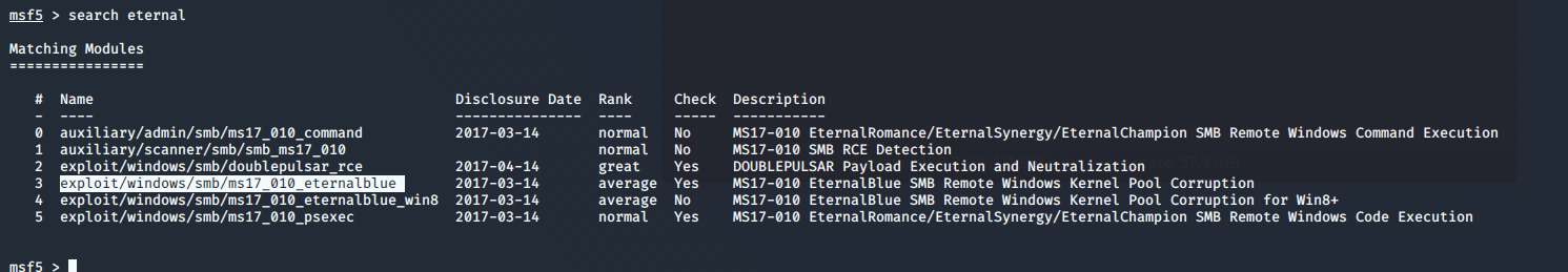 Let's see use the Metasploit module on this one.  Use msfconsole and then search for eternal.  We get 6 responses.