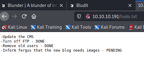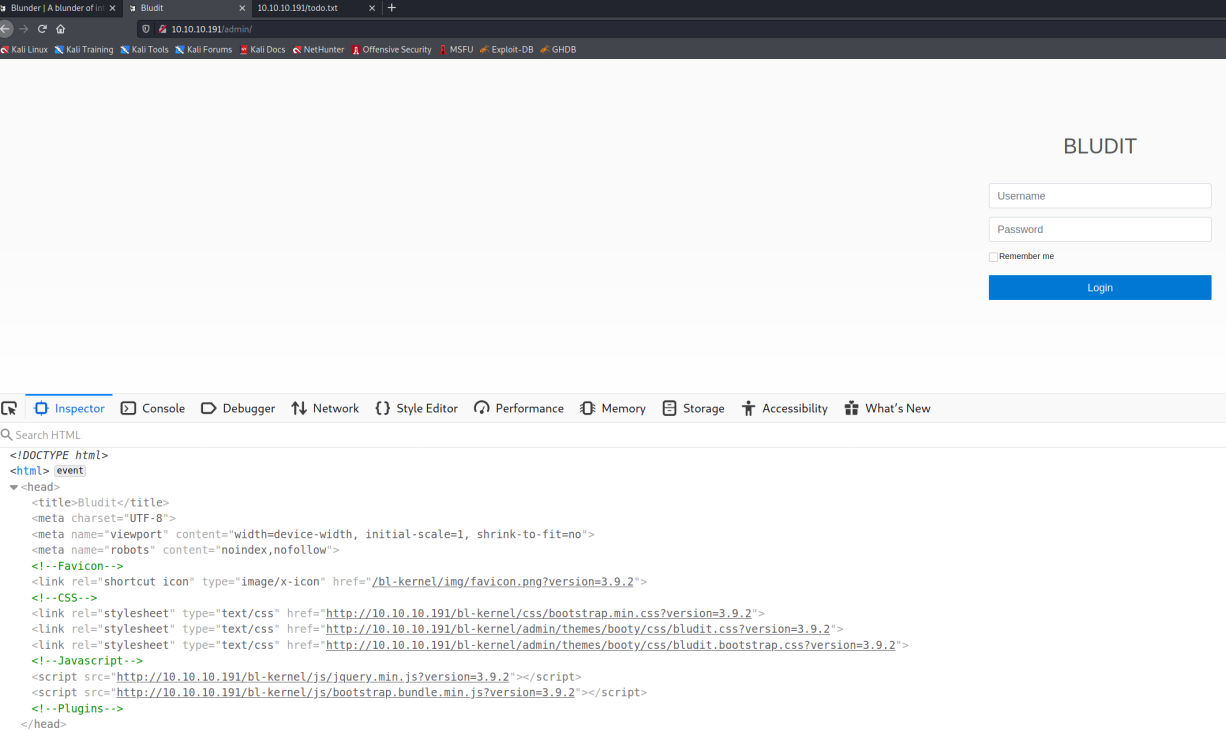 We see an admin and a todo.txt file that look interesting. Admin takes us to a Bludit Admin Login page and todo.txt gives us a possible username. NOTE: Traditional Brute-forcing this will not work. 10 attempts and your IP gets blocked for a while. Consider it fair warning. However, that doesn't mean there's not another method of finding the password.