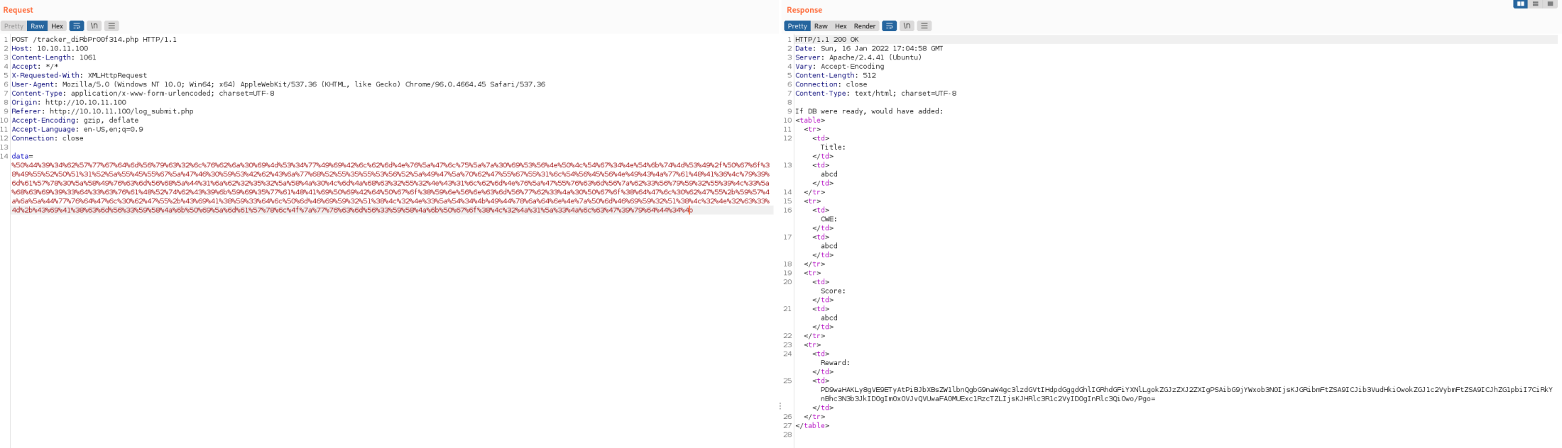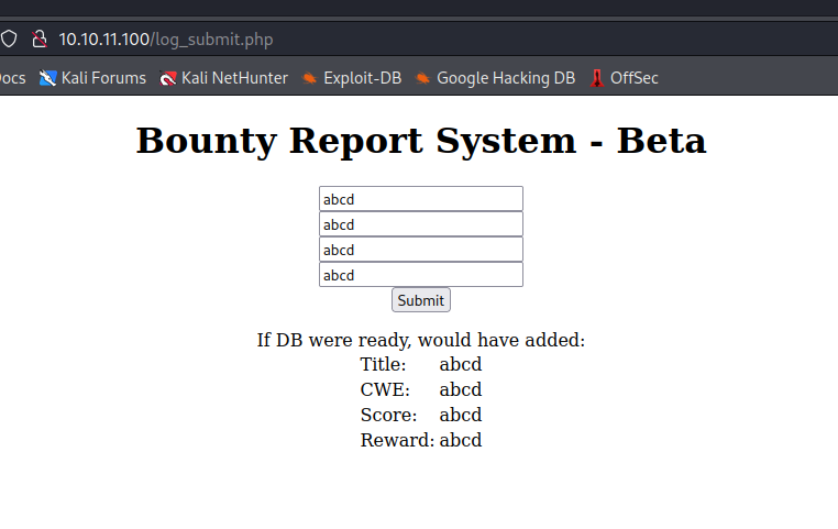 So, we see a db.php in the main Gobuster, but it's empty. Inside of Resources, there's a README.txt file that basically tells us that the DB is not operational, but the scripts surrounding them are. Let's check portal.php (from the main Gobuster output) and see what we can see. There's a link on Portal that takes us to http://10.10.11.100/log_submit.php (which didn't show up on either Gobuster). Filling in dummy data, we glimpse what could be an XML External Entity (XXE) attack vector.