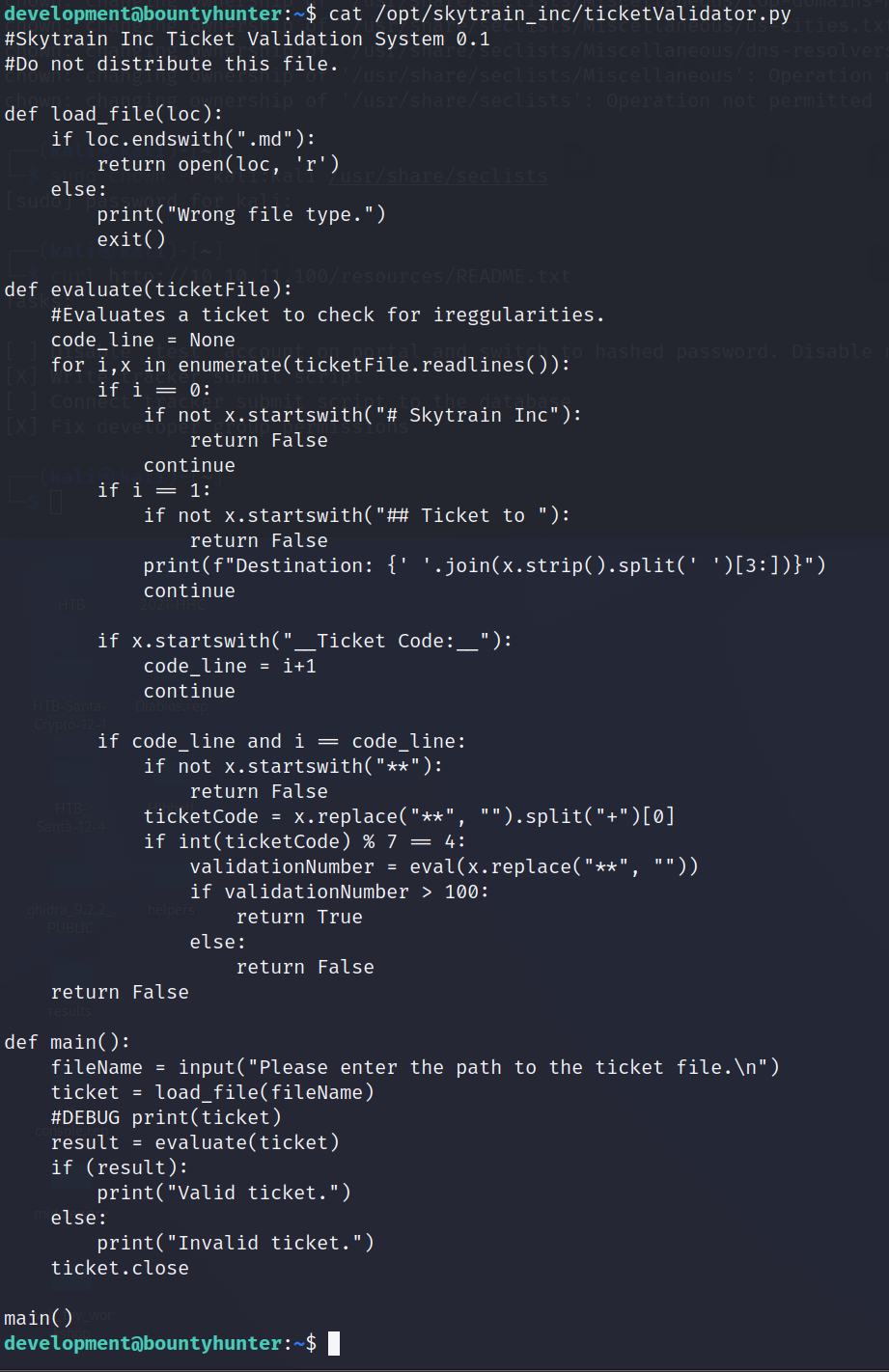 From the script, we can see that the ticket must have a .md extension, must start with Skytrain, and must include Ticket to 'something'. Let's see if we can craft one using system to call /bin/bash. I'm going to use: