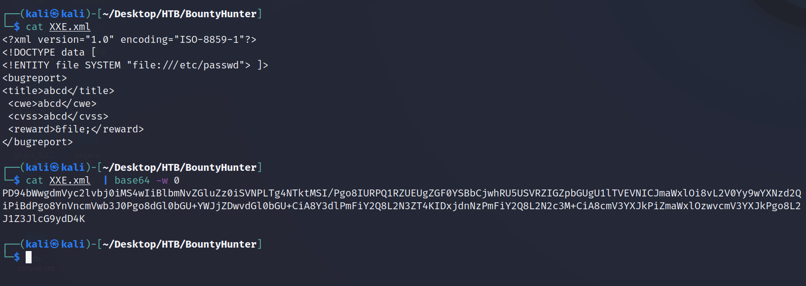 Validation! It is abcd in each of the field and is an XML format, meaning we have found our XXE method. Now, we need to validate that it executes on the system. We can do this by crafting a "cat /etc/passwd" string into Base64 + URL encoding and see if we can capture the results. The bonus to this method is that it not only validates the XXE, but also let's us enumerate users on the machine. Create an XML file with the below info (notice the ENTITY file SYSTEM and the &file; fields) and then we can Base64 + URL encode that file.