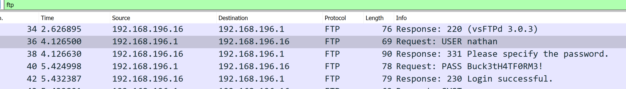 Following the HTTP stream we find a data directory, which is not surprising since the "snapshot" page was /data/1. This may be an IDOR (Insecure Direct Object Reference) vector! The 1 is the <id> of the requestor. Let's navigate to /data/0 and see what changes in the PCAP. I'm using 0 because the original PCAP was located at data/1. Sure enough, if we look at the FTP stream, we instantly find a username and password.
