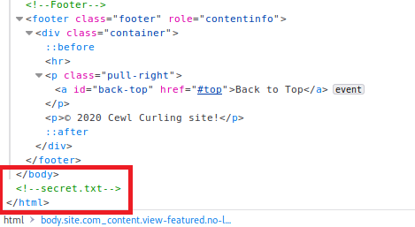 From the main page, we catch 2 names.  The "Written By" name of Super User, and the signature on the "My first post of Curling in 2018" name of floris.  Checking the source code, we also see a secret.txt comment between the closing body