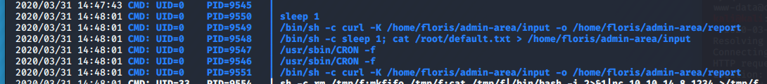 What does curl -K do? It sets a config file for a cron job. See, there IS a cronjob running. Let's take a look at the admin-area/input file.