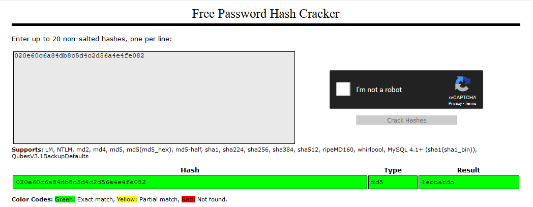 So, we have an MD5 string of '020e60c6a84db8c5d4c2d56a4e4fe082'. Let's throw it into Crack Station and see what happens.