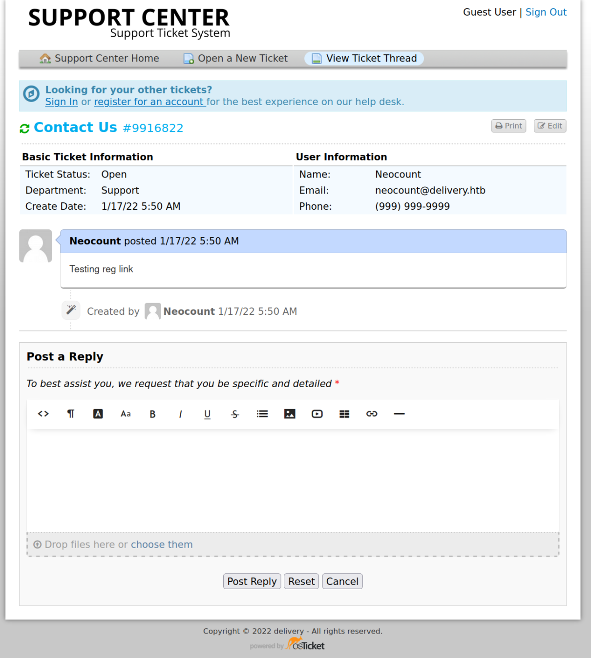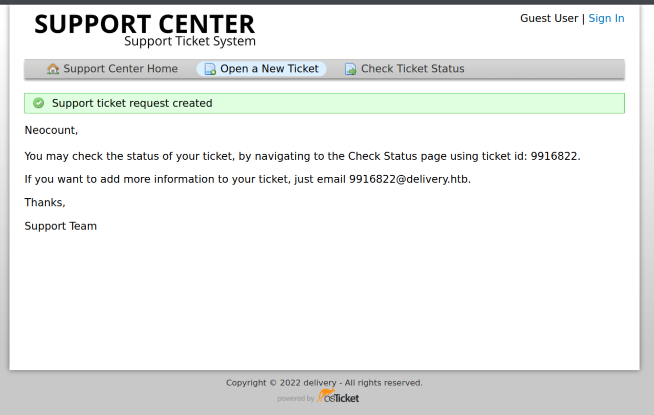 We need to add 10.10.10.222 delivery.htb helpdesk.delivery.htb to our /etc/hosts file before we navigate to it.