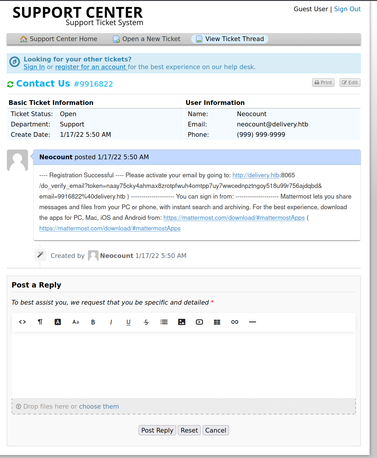 but it really only works if we have an @delivery.htb email address. Let's try opening a ticket and see what happens. Entering dummy information and submitting the ticket, presents us with a success page and (surprise) a delivery.htb email address! Now let's check the ticket status on one tab, and register on the MatterMost page at the 8065 port and see if the registration confirmation comes to us. Once we click on that registration link and sign in, we can join the internal team and see the Internal chat channel with the following goodies!