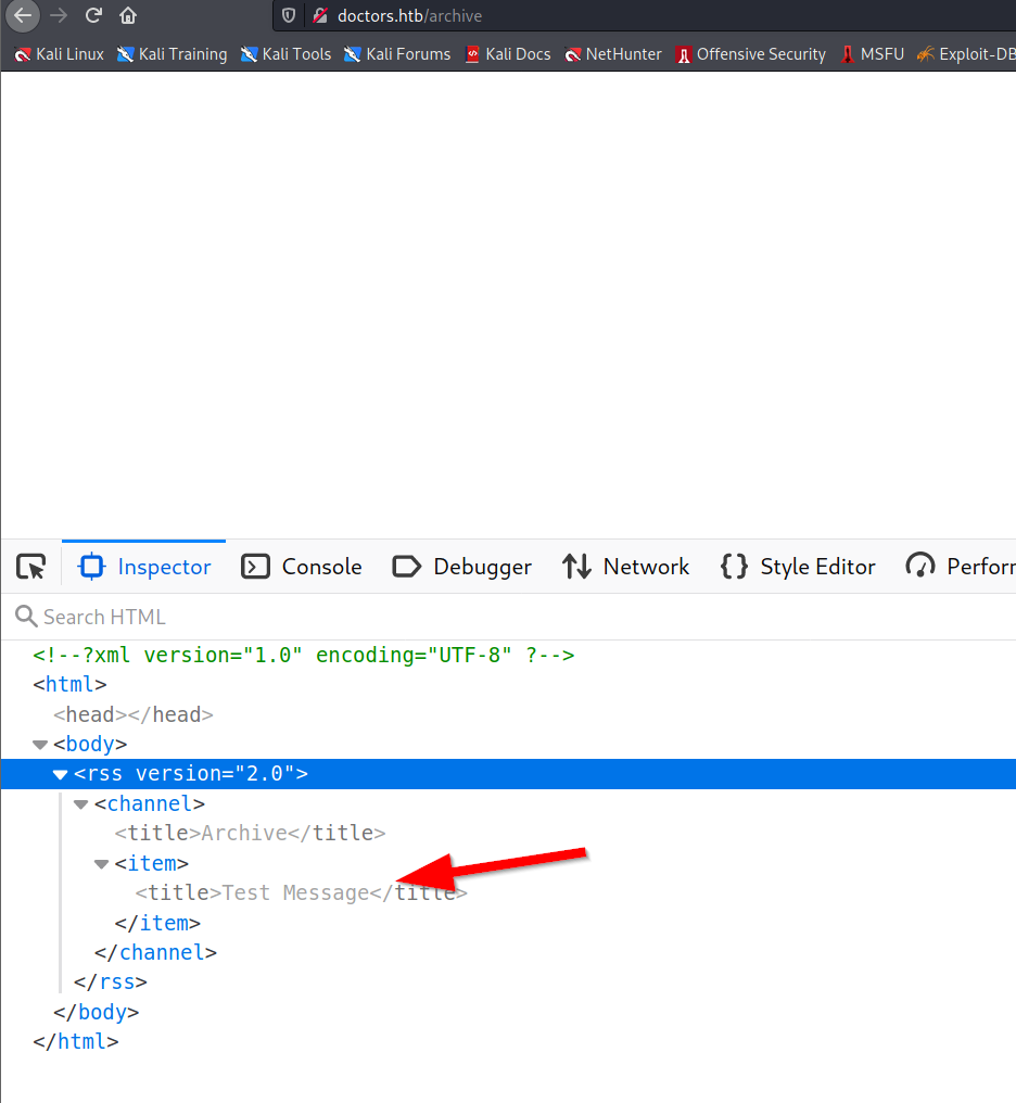 Navigate to http://doctors.htb/archive and view the Source. The Title of that Test Message will be there.
