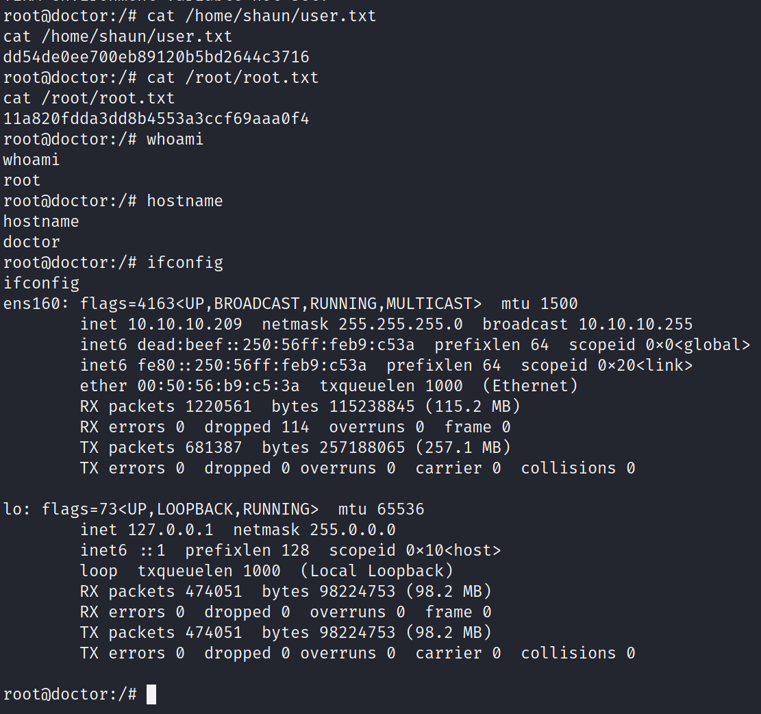 Your Netcat listener will pick up on the callback and you will have a root shell. Grab your proof (user.txt, root.txt, whoami, hostname, and ifconfig) and you're golden! Doctor Pwned!