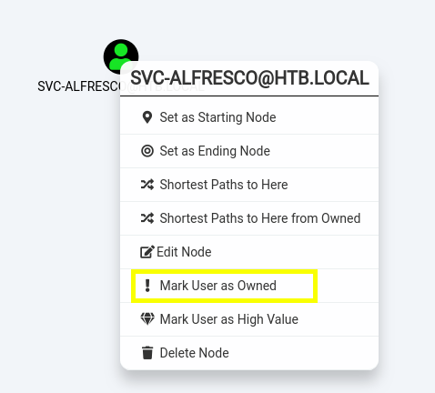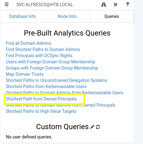 If this is your first time using BloodHound, or you are using it for the first time on a fresh install, you first need to go to http://localhost:7474 and change the neo4j:neo4j default credential. When you run bloodhound, you'll need to use those new creds. Set your starting "node" as [email protected]. When BloodHound shows you the user, right click on it and select owned. Click on the 3 stacked horizontal lines (the hamburger :D) and select the Queries tab. From there, select "Shortest Path from Owned Principles"