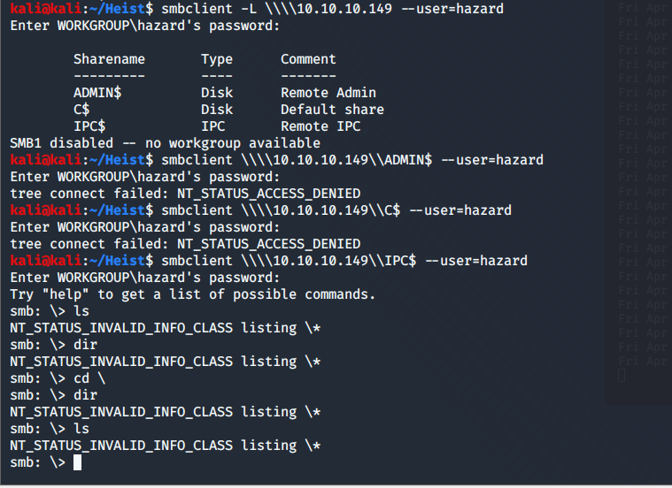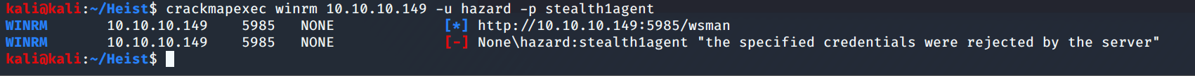 Lo and behold! Our old buddy Hazard reused the type 5 stealth1agent password. I try smbclient, but that was an enormous fail. Hazard has no access, which is probably a good thing. Let's try WinRM. Nope Another fail. RID Brute forceing??