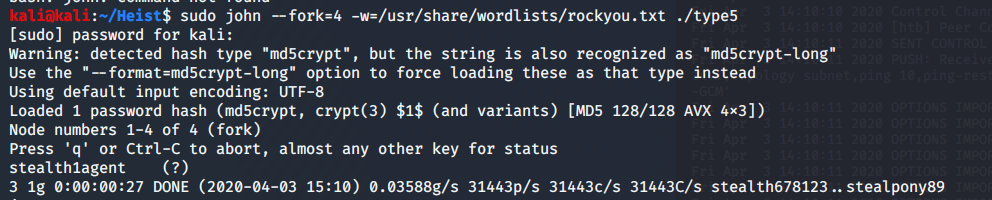 sudo john --fork=4 -w=/usr/share/wordlists/rockyou.txt ./type5